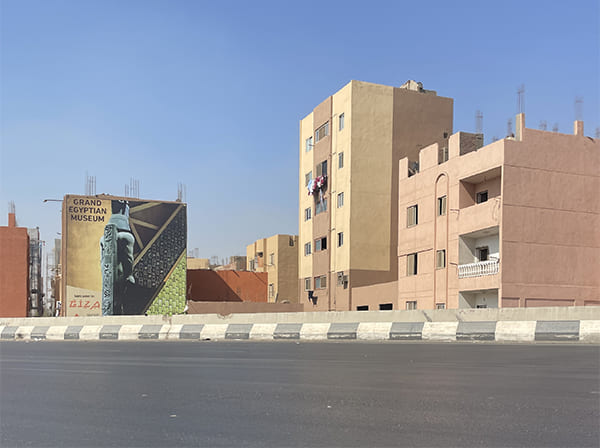 لكن إن عدت إلى الواقع، فعلى مدّ البصر، ترى صور الملوك تطل على الطريق الدائري المؤدي إلى المتحف، تغطي واجهات البنايات المطلية حديثًا، وإلى اليمين قليلا، الطريق الرئيسي إليهم ممهد وواسع، خاصة المجاور للأهرامات، لكن مازال هناك الكثير من أعمال الإنشاءات، وأبعد قليلا إلى الأمام، مطار سفنكس الجديد، فهو جزء من أعمال التطوير الشاملة لتسهيل كل السبل إليهم.