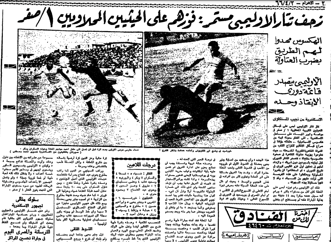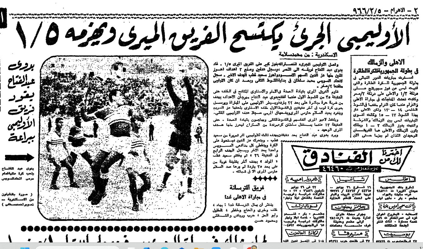 في آخر مباراة بالدوري بين الأولمبي والأهلي، وكانت في موسم 1958 أو 1959، كان الأحمر قد فاز بجميع مبارياته ولم يخسر أي مباراة.
