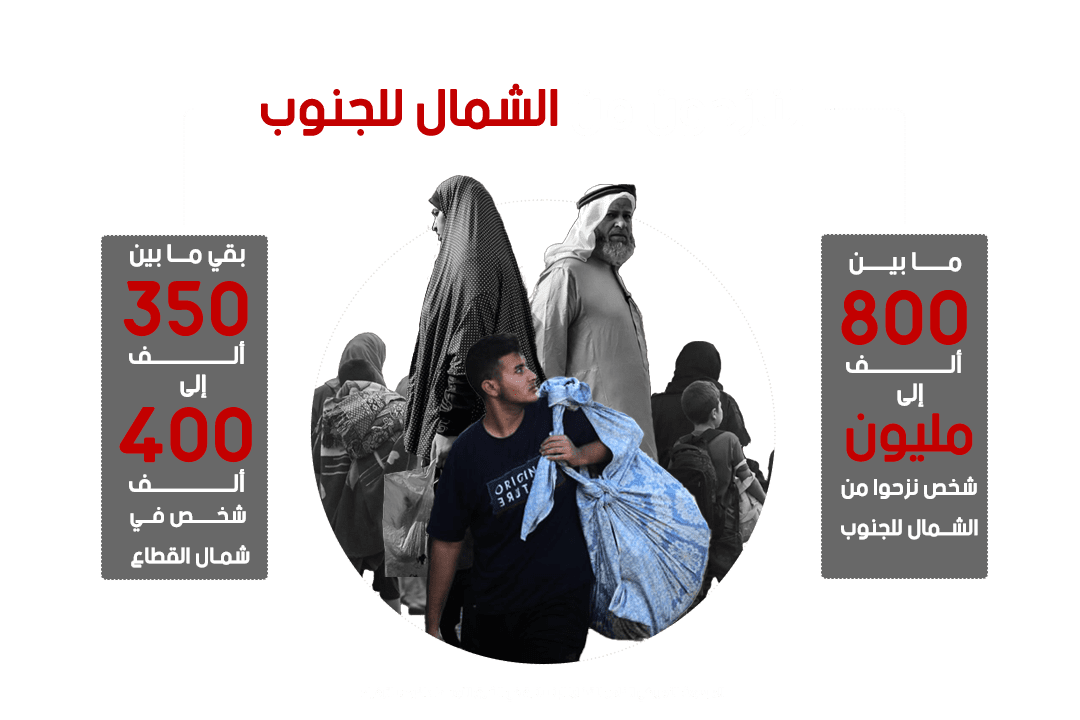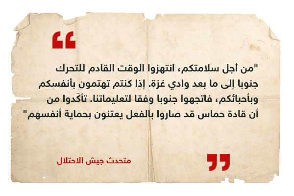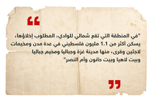 في الـ12 من أكتوبر خرج جيش الاحتلال الإسرائيلي، يهدد ما يقرب من نصف سكان غزة البالغ عددهم 2.3 مليون نسمة، للنزوح إلى النصف الجنوبي خلال 24 ساعة. وقال الجيش إن الأمر يهدف إلى إبعاد المدنيين عن أهداف حركة حماس، التي يعتقد أنها تتركز في الشمال، حينها قال جيش الاحتلال أن المنطقة سيكون بها نشاط عسكري كبير، ولهذا السبب نطلب من المدنيين التوجه جنوب نهر غزة.