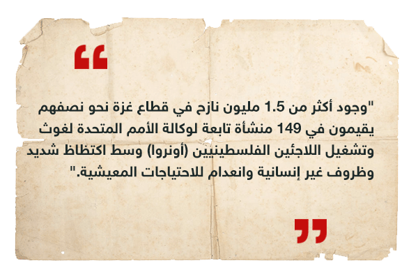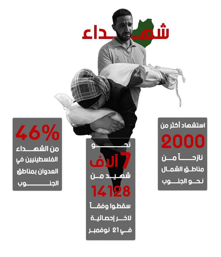 وقدر مكتب الأمم المتحدة لتنسيق الشؤون الإنسانية (أوتشا) في 24 أكتوبر، عدد الذين نزحوا داخل غزة بأكثر من 1.4 مليون فلسطيني، نزحوا من منازلهم خلال أسبوعين منذ بدء العدوان إما بسبب الخوف أو بسبب تدمير منازلهم أو تضررها، لاسيما بعد تلقيهم تحذيرات من الجيش الإسرائيلي بالإخلاء، هذا الرقم الذي زاد بالفعل بسبب شدة الضربات خلال الأيام الماضية.