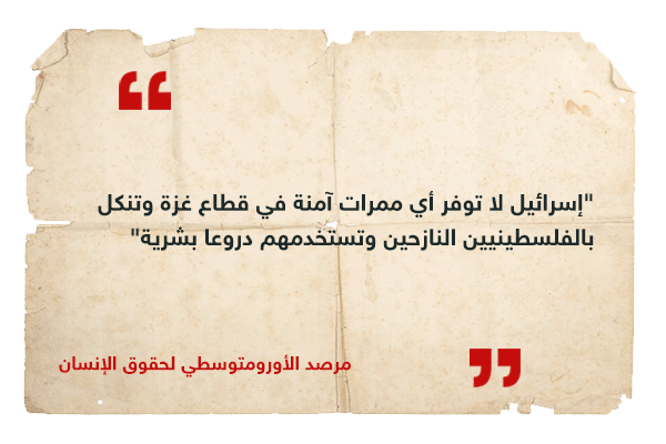 ووثق المرصد الحقوقي عمليات تنكيل يتعرض لها نازحون فلسطينيون لدى محاولتهم التوجه نحو جنوب منطقة وادي غزة من قوات الجيش الإسرائيلي التي تطوق مدينة غزة بالكامل وتقسم القطاع.