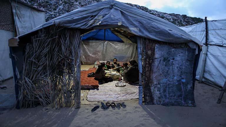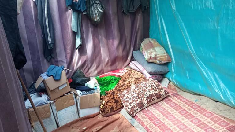 "لما حسينا حالنا طولنا والله خجلنا من الناس" أقامت عائلة رنا رفقة أقارب لهم بالمحافظة الوسطى، لم يمكثوا إلا أيامًا قليلة حتى شعروا أنّ عليهم البحث عن مكان آخر، خاصة وأنّ الحرب جعلت الجميع يعيش ظروفًا صعبة لذا طلبت العائلة الخروج، لتستقر في رحلة نزوح أخيرة داخل خيمة في مخيم إيواء بالمحافظة الوسطى يستقرون بداخلها إلى اليوم.
