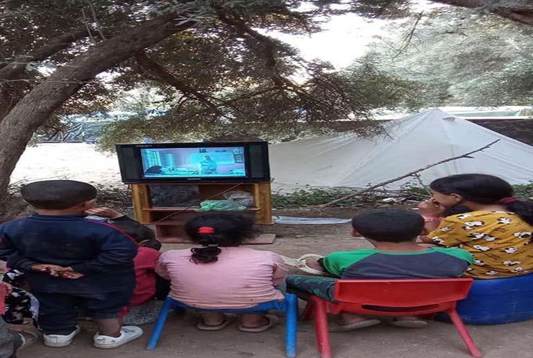 حتى الأطفال فقدوا طقوس الشهر ولم يعد أمامهم سوى بهجة التجمع أمام شاشة صغيرة أُنقذت من تحت أنقاض المنازل، فما بين اللهو بين الحقول والخيام أو الجلوس لمشاهدة الكرتون المفضل على الشاشة وسط الحقل.