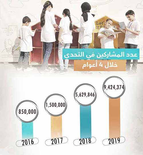 "تحدي القراءة العربي" هو أكبر مشروع عربي أطلقه الشيخ محمد بن راشد آل مكتوم، نائب رئيس دولة الإمارات العربية المتحدة، رئيس مجلس الوزراء "حاكم دبي"، لتشجيع القراءة لدى الطلاب في العالم العربي، ويأخذ التحدي شكل منافسة للقراءة باللغة العربية يشارك فيها الطلاب عبر المراحل الخمس سالفة الذكر؛ وصولاً للتصفيات النهائية والتي تُعقد في دبي سنويا.. بدأ التحدي في 15 سبتمبر 2015، وتم إعلان جائزة الدورة الأولى في أكتوبر 2016، ويعقد حفل إعلان بطل التحدي في دورته الرابعة، في نوفمبر 2019، ويحصل الفائز باللقب على مستوى الوطن العربي على 500 ألف درهم إماراتي.
