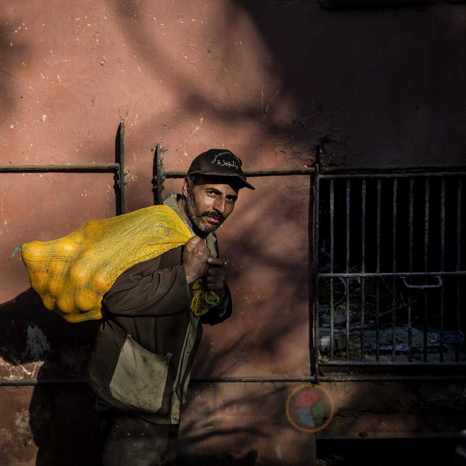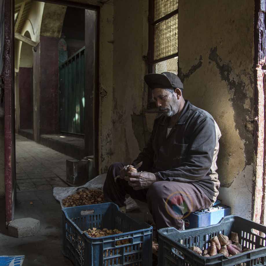 في ناحية بعيدة عن زوار بيت الفيل، جلس صالح محمد، أمام جوال من البطاطا، وانهمك في تقطيعها وتنظيفها قبل إلقائها في قفص خشبي.