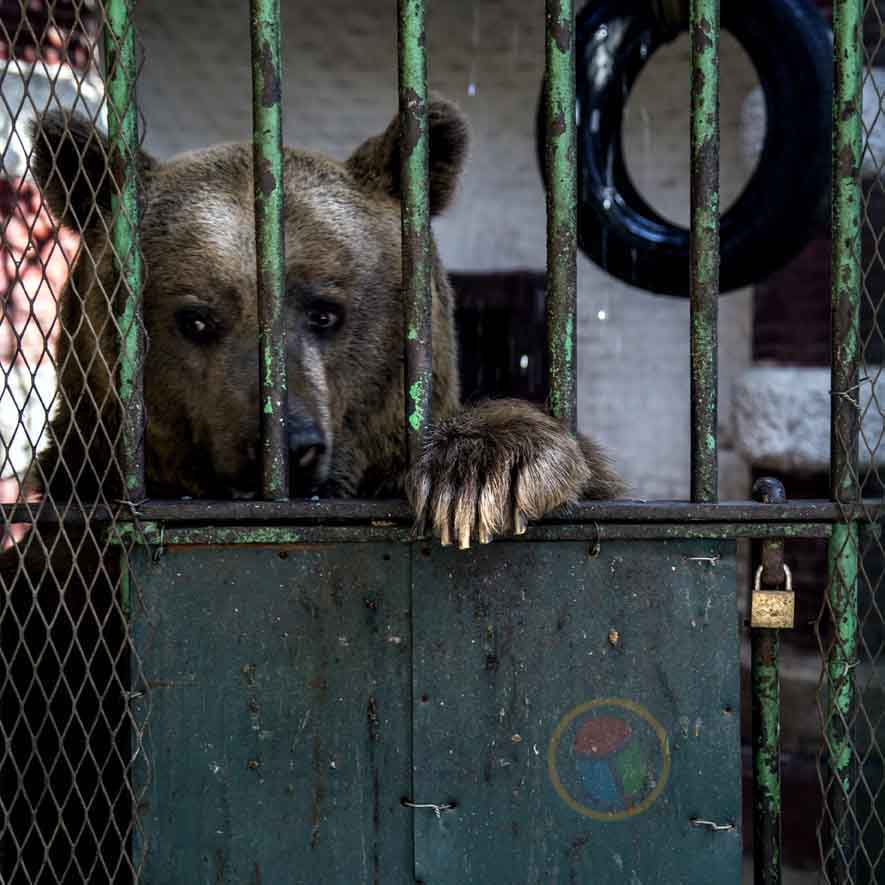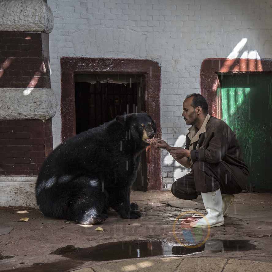 داخل قفص الدببة، وقف محمد رزق يغني للحيوانات بصوته العذب، وينادي على كل منها باسمه مناولاً إياها الطعام.