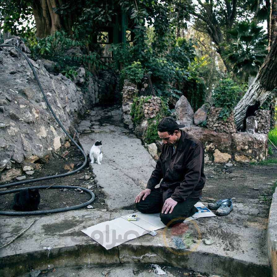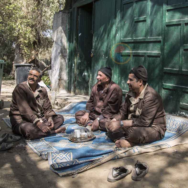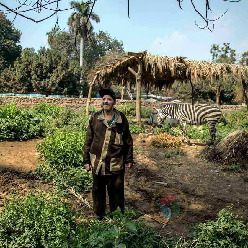على بسطة من القش يجلس "عم سعيد"، أمام الحطب المشتعل ليعد الشاي لزملائه الكلافين، ويغمس النعناع الأخضر، الذي يزرعه بنفسه في قطعة أرض صغيرة، قبل أن يحكي لنا بفخر عن أولاده وأحفاده، وعن عمله في الحديقة الذي لم يكن مقدراً له حيث غادر بعد يومين من بداية عمله، ثم أرسل مدير الحديقة حينها لاستدعائه وألح عليه ليبقى في عمله.