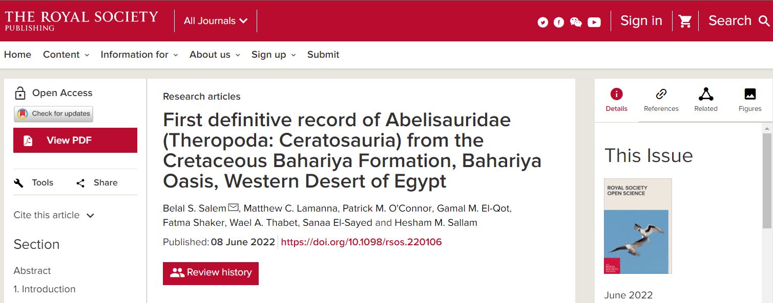 في الثامن من يونيو نشرت المجلة العلم Royal society open science، الدراسة البحثية لفريق "سلام-لاب" بمركز المنصورة للحفريات الفقارية، تحت إشراف عالم الجيولوجي المصري، هشام سلام، قائد الاكتشاف الشهير "منصوراصورس" قبل نحو أربعة أعوام.