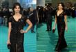 حيث ارتدت فستان من اللون الأسود البسيط، مفتوح من ناحية الصدر ذو فتحة كبيرة من ناحية إحدى ساقيها، بتوقيع دار Versace.