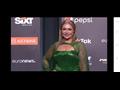 وطلت على السجادة الحمراء بفستان أخضر طويل لامع بصيحة الكب، وكمه شفاف وبه خطوط خضراء لامعة، واعتمدت مكياجا هادئا للغاية، واختارت معه تصفيفة شعر تتناسب معه.