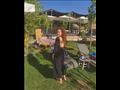 ظهرت ريا وهي أمام حمام سباحة وترتدي جامبسوت أنيقة باللون الأسود أظهر رشاقة جسمها مصنوعة من الشيفون ومفتوحة من الخلف ومزينة بتطريز على شكل نجوم باللون الأصفر.
