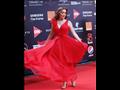 وارتدت فستانا طويلا كت باللون الأحمر، متعدد الأدوار ومزود بحزام باللون الأحمر عند منطقة الخصر، ونسقت مع إطلالتها حذاء باللون الذهبي.
