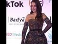 واعتمدت مكياجاً قوي، واختارت أن يكون شعرها منسدل على جانبي كتفيها.