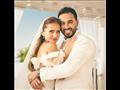 أما زوجها فقد ارتدى تيشرت باللون الأبيض.