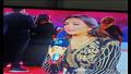 ظهرت بفستان طويل بأكمام طويلة باللون الأسود، مزين بخطوط متداخلة باللون الجولد بطريقة جعلته يشبه القفطان المغربي.