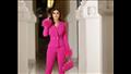 وظهرت بإطلالة جذابة ومثيرة مرتدية بدلة باللون الفوشيا، ونسقت معها شنطة جلد من نفس اللون.