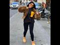 وظهرت مرتدية جاكيت قصير بصيحة الفرو باللون البني، ونسقت أسفله تيشرت وبنطلون باللون الأسود.