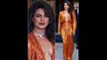 وأطلت بفستان طويل باللون البرتقالي اللامع بأكمام طويلة ومكشوف عند منطقة الصدر.