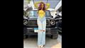 وظهرت درة بتوب باللون البستاج، ونسقت أسفله بنطلون جينز فاتح.