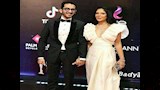 أما الفنانة ميار الغيطي، فأطلت بفستان باللون الكشمير بقصة الكب، واعتمدت مكياجًا قويًا، وتركت شعرها الويفي منسدلًا، بينما ارتدى زوجها بدلة باللون الأسود.