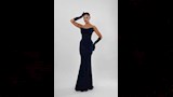 يتميز الفستان بجزء علوي بدون حمالات، مع تفاصيل درابية، وتنورة منسدلة بطراز ذيل السمكة.