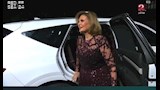 وتألقت الفنانة منى زكي بفستان طويل باللون الفضي بصيحة الريش وبقصة الكب.