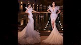 الجزء العلوي من الفستان مزين بتطريزات باللون الفضي اللامع، مع تصميم ثلاثي الأبعاد للأكتاف يشبه أجنحة من الريش تضيف لمسة درامية للإطلالة.