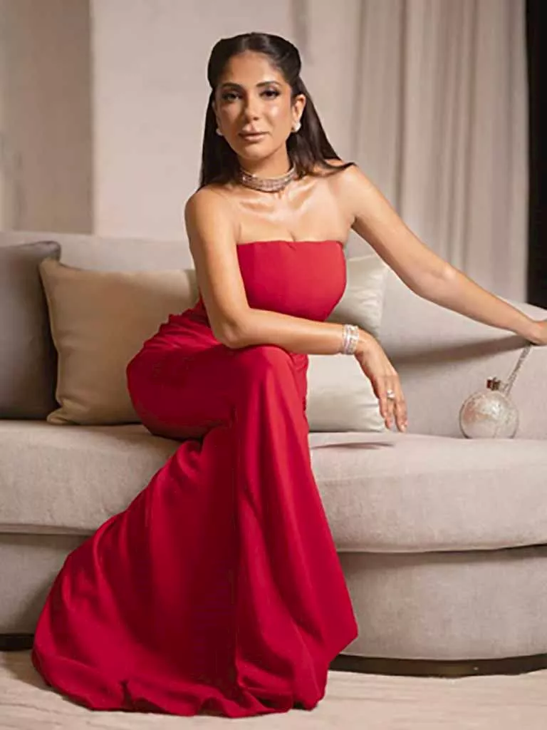 أطلت الفنانة مني زكي مرتدية فستان طويل باللون الأحمر الناري بقصة ضيقة على الجسم، توقيع مصمم الأزياء رامي القاضي، وتنسيق الاستايلست ريم سامي شقير.