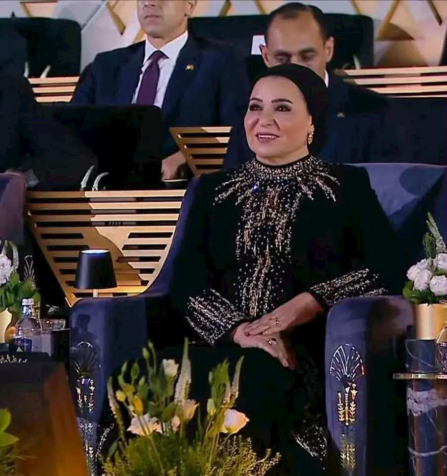 لفتت السيدة انتصار السيسي الأنظار بإطلالة ملكية راقية خلال افتتاح المتحف المصري الكبير، حيث تألقت بفستان أسود أنيق يحمل طابعًا فرعونيًا أصيلًا.