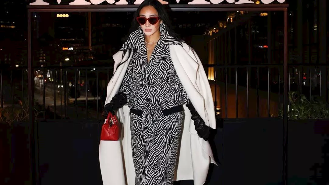 وظهرت لوجينا صلاح بطقم بنقشة الزيبرا بالأبيض والأسود، بتصميم منسق يضم توبًا وجيبًا مستقيمين يمنحان القوام مظهرًا أكثر طولًا ورشاقة.