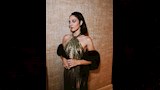 وارتدت فستانًا طويلًا باللون الأخضر اللامع من تصميم المصمم اللبناني العالمي إيلي صعب.