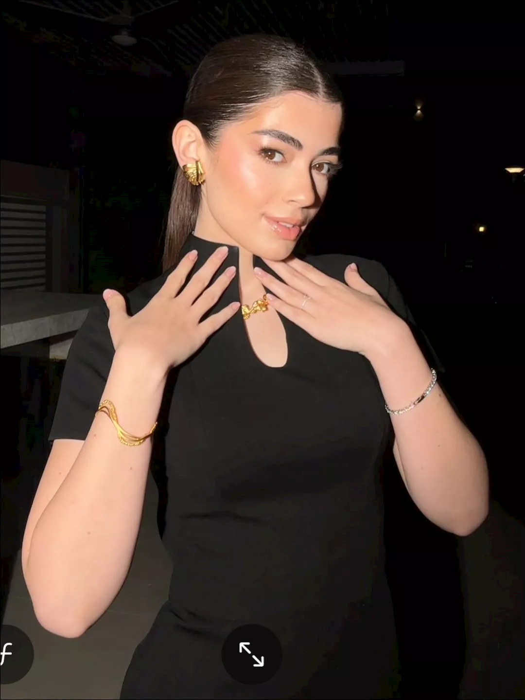واعتمدت تسريحة شعر مستقيمة، اختارت مكياجاً طبيعياً يركز على تحديد العيون بـ "أيلاينر" وأحمر شفاه بلون نيود خفيف.