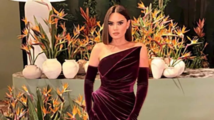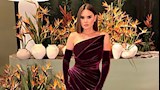 وارتدت رشا مهدي، فستانًا مخمليًا باللون البرجندي الداكن، يبرز القوام بانسيابية فخمة.
