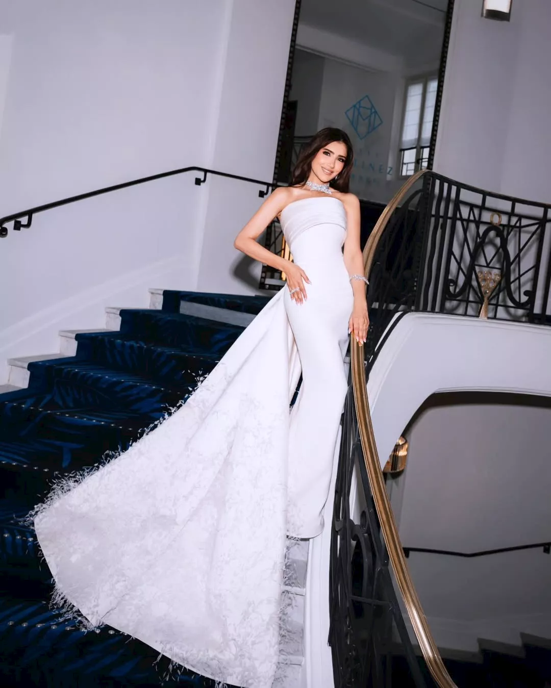 خطفت الفنانة مي عمر الأنظار بإطلالة كالعروس، إذ ارتدت فستانا طويلا باللون الأبيض بقصة "الكاب" مع إكستنشن من توقيع رامي قاضي، ونسق الاستايلست اللبناني سيدريك حداد الإطلالة، مع مكياج ناعم وتسريحة شعر منسدلة على الكتفين، وزينت مجوهراتها بالكوليه والحلق والأسورة.