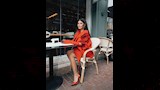ظهرت جومانا مرتدية جاكيت قصير فوق الركبة باللون البرتقالي، بتصميم مميز، مزين بوردة كبيرة مُلفتة على الكُم.