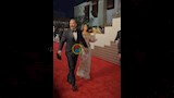 أما زوجته ظهرت بإطلالة جريئة حيث ارتدت فستان طويل باللون الفضي بقصة "الكب" مزينا بتطريزات باللون الفضي.