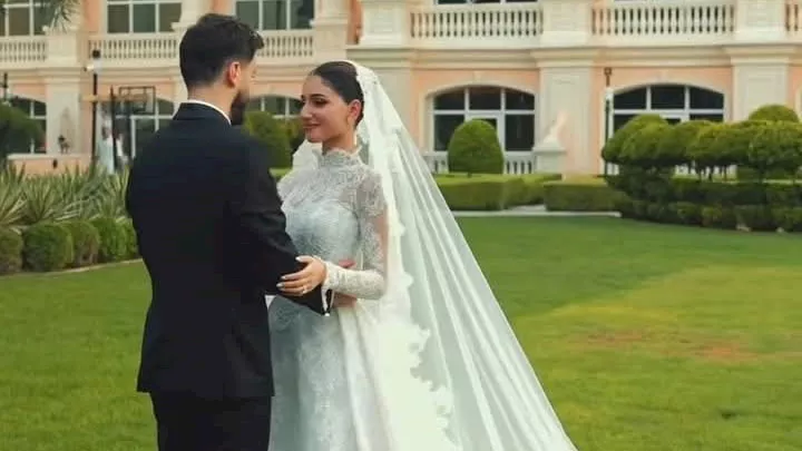 تألقت العروس بإطلالة ساحرة، حيث ارتدت فستان زفاف طويل باللون الأبيض، تميز بتصميمه الكلاسيكي والمطرز بالدانتيل الفاخر.