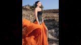 كما أن الجزء السفلي من الإطلالة عبارة عن تنورة واسعة وطويلة باللون البرتقالي الزاهي، وهذا خلق تباين لوني مميز مع الكورسيه الأسود وأضاف على الإطلالة لمسة من الحيوية والدفء.