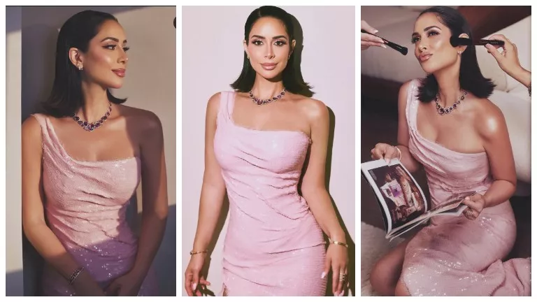فستان وردي لامع بقصة مميزة