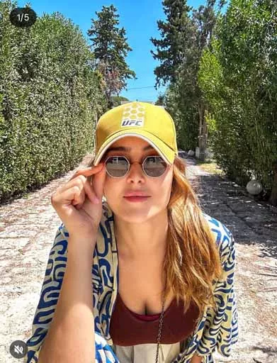 ونسقت معه الكاب بيسبول صفراء بلوجو، تضيف لمسة رياضية وعصرية وتُظهر شخصية مرحة وواثقة.