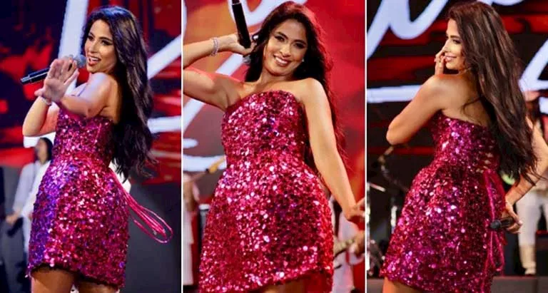 أطلت المطربة أنغام بفستان طويل باللون الفضي اللامع بقصة الكب وبصيحة الظهر المكشوف، واعتمدت مكياجا ترابيا، وتركت شعرها الويفي منسدلا.