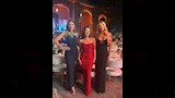 واعتمدت مكياجا قويا، إذ وضعت أحمر الشفاه باللون الأحمر الناري، واختارت أن تترك خصلات شعرها منسدلا على كتفيها.