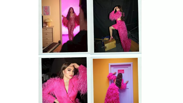 وفي إطلالة أخرى، ارتدت جامبسوت شفاف باللون الفوشيا، مزينا بتطريزات لامعة، ونسقت معه جاكيت من الفرو بنفس الدرجة.