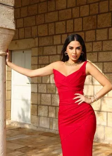 ظهرت الفنانة نسرين طافش بفستان طويل باللون الأحمر بـ إكستنشن بنفس اللون من تصميم moonmains.