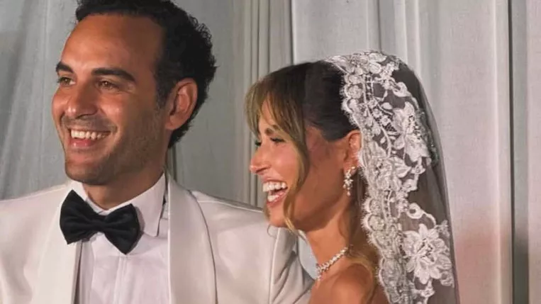بينما ارتدى زوجها بدلة باللون الأبيض، ونسق أسفلها قميص بنفس اللون، ورابطة عنق باللون الأسود.
