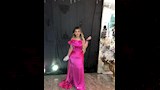 ظهرت ياسمين مرتدية فستانا طويلا واسع القصة باللون الأزرق الفاتح، مزينا بنقوش ورود ملونة.