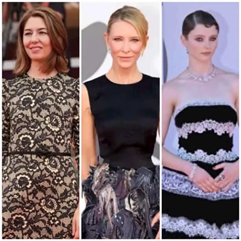 ارتدت المخرجة الأمريكية صوفيا كوبولا فستانا طويلا بقصة قديمة مزيج من اللونين الأسود والذهبي، بقصة انسيابية على الجسم، واختارت تسريحة الشعر المنسدل على كتفيها.