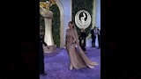كما جاء تصميم الفستان مزودا بفتحة ساق جريئة ومزينا بتطريزات لامعة، وبأكمام طويلة ومنسدلة.