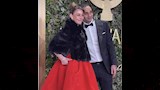 بينما ارتدى زوجها بدلة باللون الأسود، ونسق أسفلها قميص أبيض ورابطة عنق سوداء.