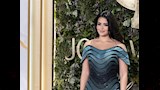 ارتدت أسماء فستانا طويلا بدرجات اللون الفيروزي، تميز بأنه بصيحة "الأوف شولدر" ومزينا بتطريزات باللون الأسود وبقصة منسدلة على الجسم.
